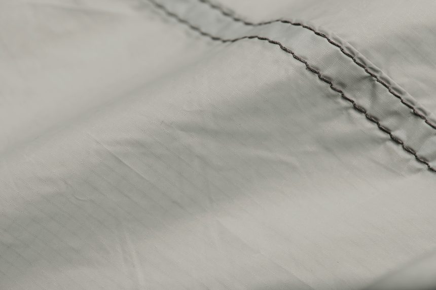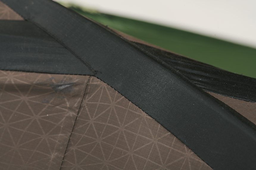 ▲漏水を防ぐためのシームテープを不要としたコーティング採用のレインフライ。正確な縫製によって耐水性を高めている