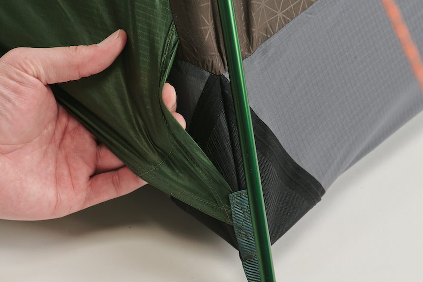 ▲レインフライと本体はトグルで接続しており、雨天時は本体を濡らさずに撤収可能