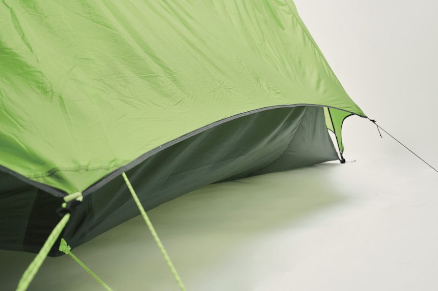 ▲レインフライは短めに設計されているが、防水処理を施したフロア生地を大きく立ち上げることで、降雨時も水が浸水しにくくなっている