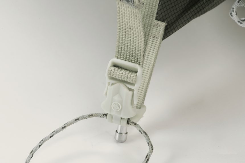 ▲レインフライの固定や調節を行なうバックルは新開発の「クイックコネクトテントフィー ト」。破損の心配が少ないアルミ合金製となっている。