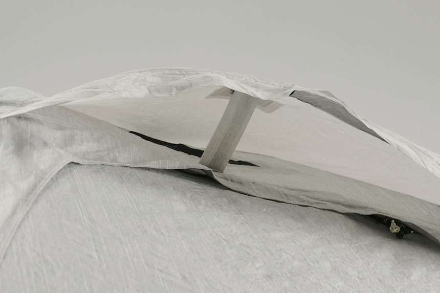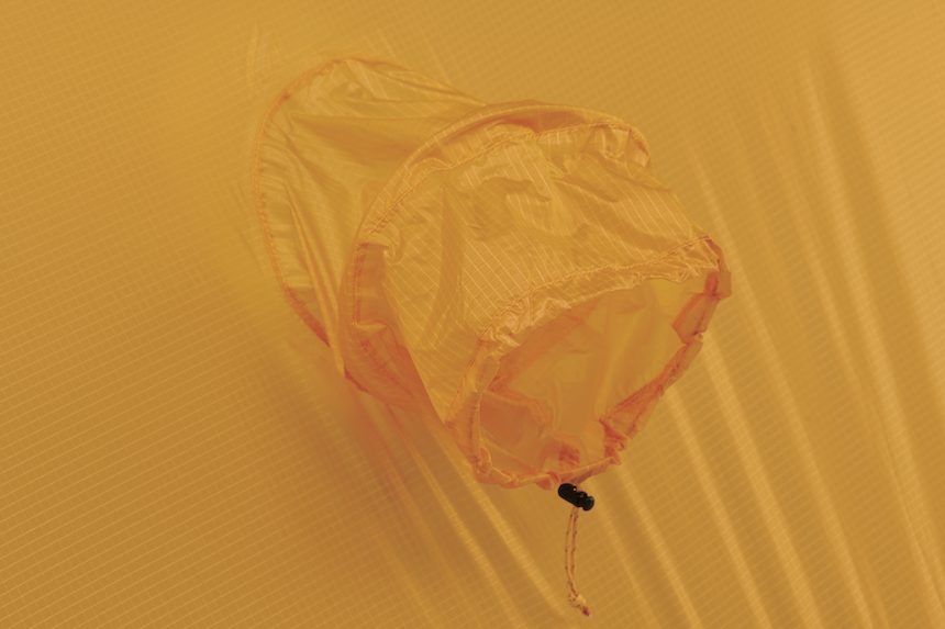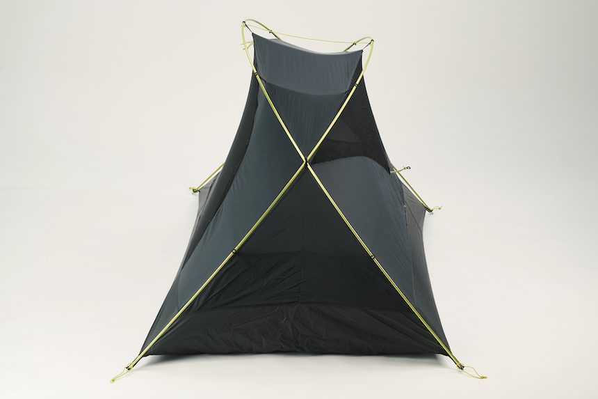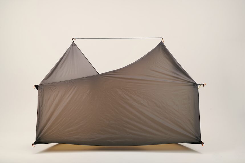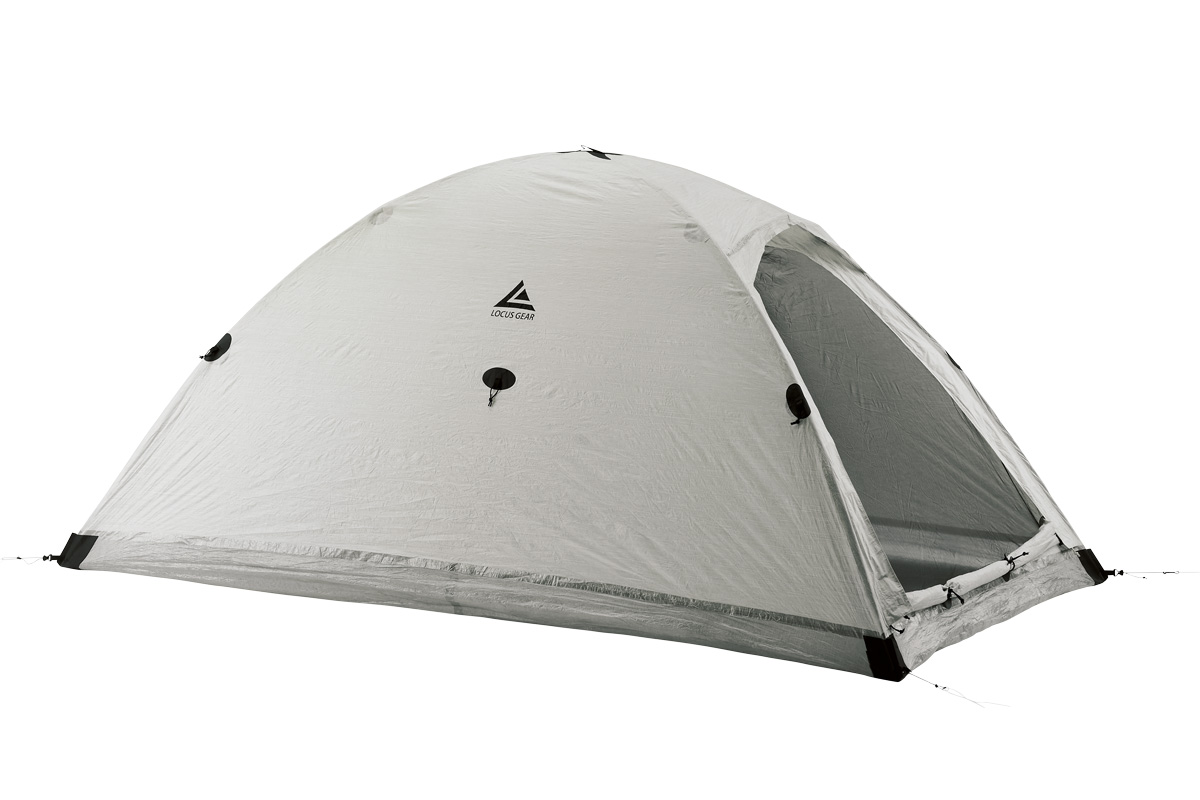 シングルウォールテントを設計するうえで、優れた強度と結露対策をいかに確保するかということが最大の命題でした。その回答が、究極の繊維ダイニーマと突出した透湿性を誇るイーベントをラミネートした、現時点で最高レベルと考える防水透湿素材DCF-イーベントです。また、立体物において幾何学的な裏付けをしながら創りだした造形については、その佇まいと美しさが強度や機能性も兼ね備えることをエジプトのピラミッドから影響を受けています。その結果、このテントの設計にあたっては縦と横、高さの比率が美しく調和するテントになるように心がけました。(ローカスギア/吉田)