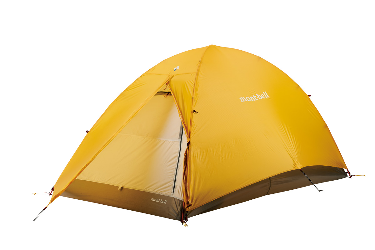 自社テントのなかで本格的な山岳用テントという位置付けのモデルです。十分な強度を保ちながら軽量コンパクトを目指した生地や部材を使用し、細部にいたるまでシンプルで優れた機能性を追求しました。構造は、最適解を考え抜いた末に、オーソドックスなドームテントに帰結。レインフライには独自に開発したナイロン610という新しいポリマーで紡糸したバリスティックナイロンを使用しています。これは、従来のナイロンよりも保水しにくく、耐候性と堅牢性が優れた素材で、降雨時などに生地が垂れ下がってしまうのを軽減してくれます。また、インナーテントとのクリアランスを確保しながら耐久性も向上しています。(モンベル/安田)