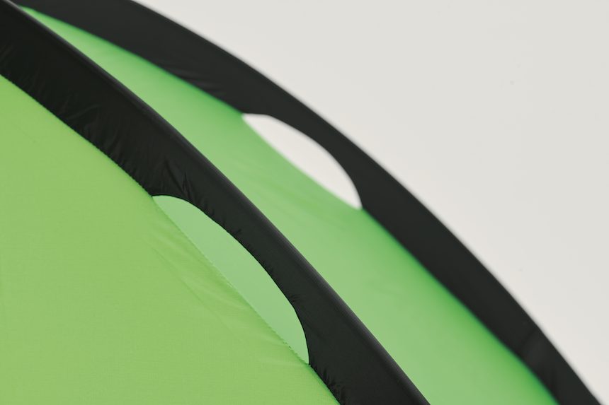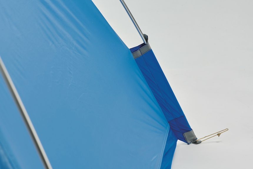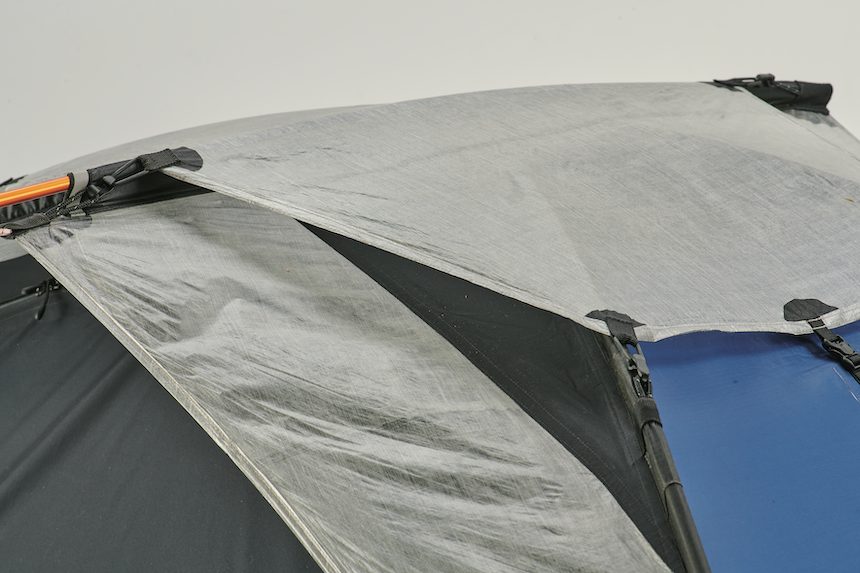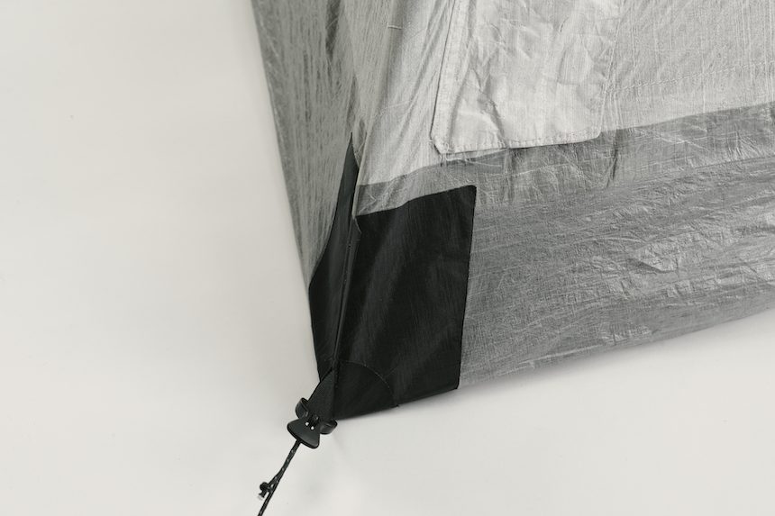 ▲テント本体四隅のポールエンド素材には、非常に耐久性が高いダイニーマとナイロンをラミネートしたDCF素材を採用する。これにより摩耗しやすい部分を保護できるよう配慮した