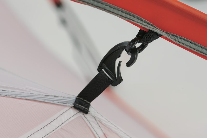 ▲テントポールをスリーブに通してフレームを先に組み立て、そのあとでインナーテントをクリップ留めして設営する「ウェブトラスト」構造を採用。これはクリップ式の軽さとスリーブ式の強度の高さの両方の利点を備え、重量対比強度を格段に向上する同社自慢の独自技術だ
