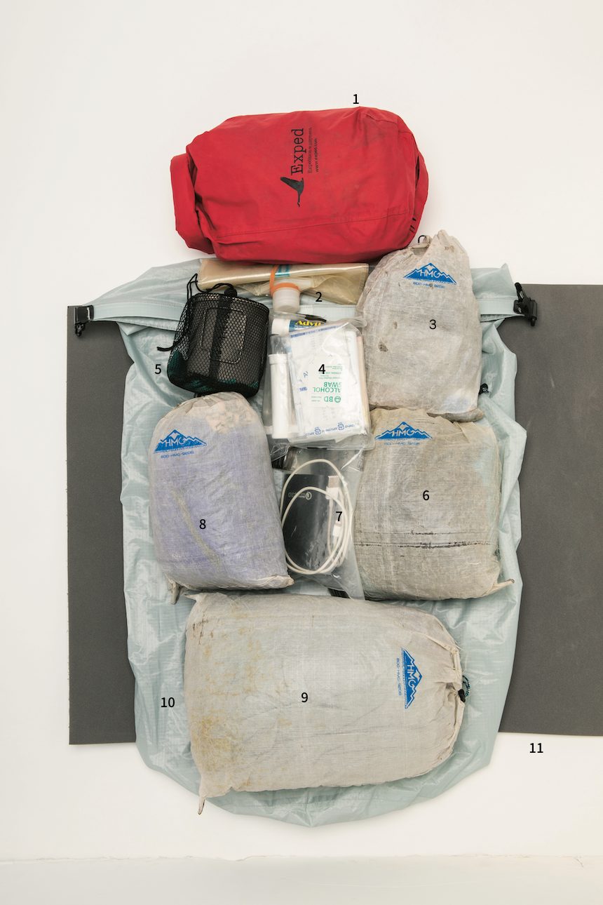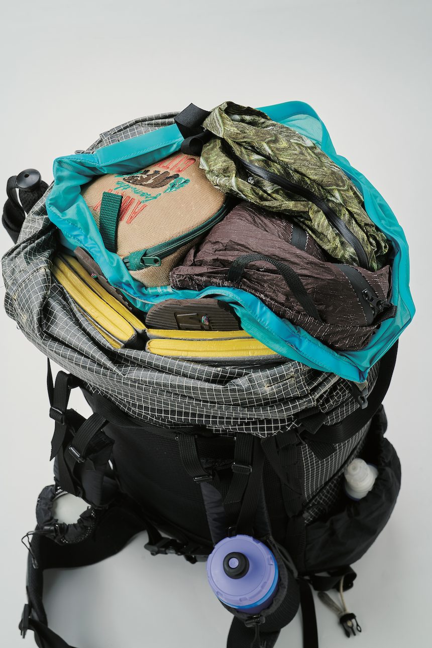 縦走用パックはシンプルなバケツ型タイプが好みで、パッキングは工夫が必要。パックと同等サイズのパックライナーで全体の防水対策をし、マットは背面に畳んで入れ、寝袋はあえてスタッフバッグにまとめずそのままクシャクシャとパックの中へ。クッカー類など硬いものをその中に埋めるように入れ、最後に防寒具で隙間を埋めるとキレイにまとまります。柔らかいもので包み込めば、見た目がよいだけでなくギアを保護でき、パックの仕上がりに凸凹や歪みがないのでバランスよく歩けます。
