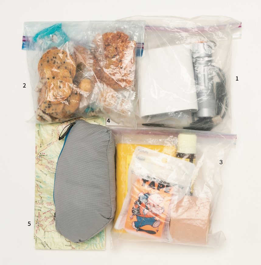暗くなってきたからライトを取り出そうと、小物を入れたスタッフバッグ内を探したけれど、見つからない。あれ、どこいった!? とバックパックからすべての荷物を出したけれど、ない……頭を抱え、雨蓋のポケットの奥に手を入れたら「!!」。先を見越して、取り出しやすいところに収納していたのでした!以来、無意識のうちに先を見越してパッキングしていた自分に倣って、すべての道具は、使う順番、シーンを想定してパッキングするようになりました。
