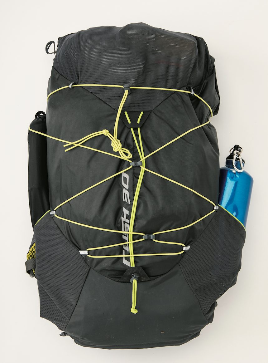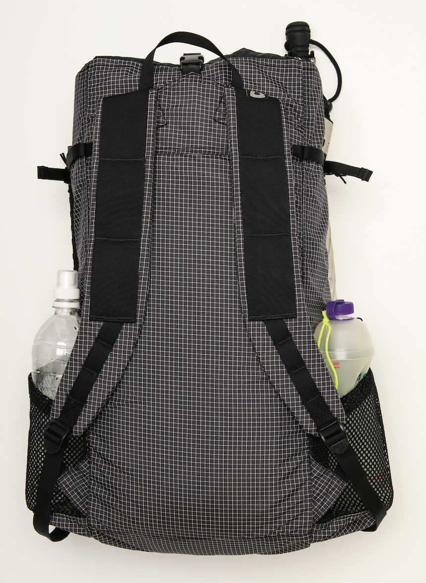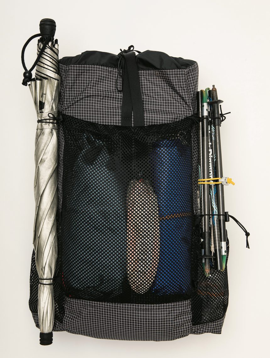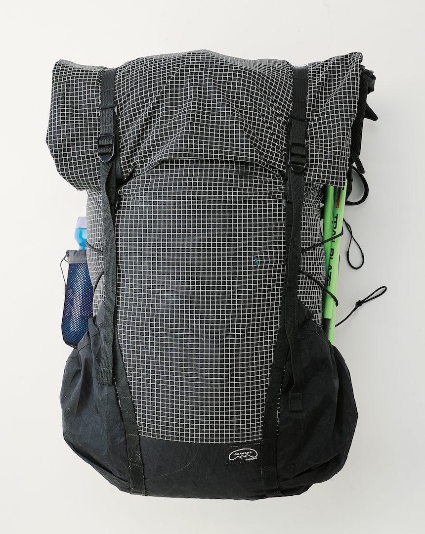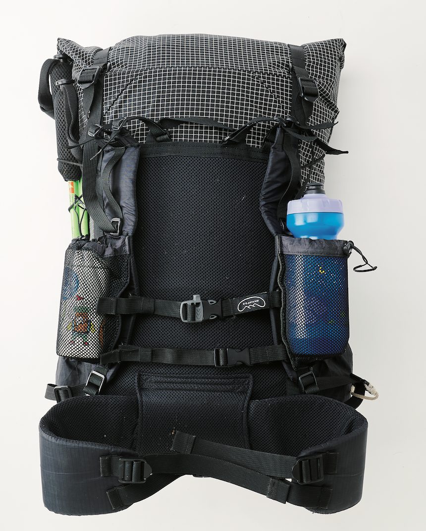 クローズドセルマットを筒状にしてバックパックに収納、その内側に大きめのパックライナーを入れて荷物をパッキング。道具の小分けはおおまかな状況ごとにすると探したりしまったりが手早くできます。個別に圧縮せず、 バックパックに詰めるときにギュっと上から押し込むことで無駄なスペースを潰し、荷物も圧縮しています。雨具やタープなど濡れ物はフロントの大きなメッシュポケットで乾燥まで管理。ULのセオリーに徹しています。