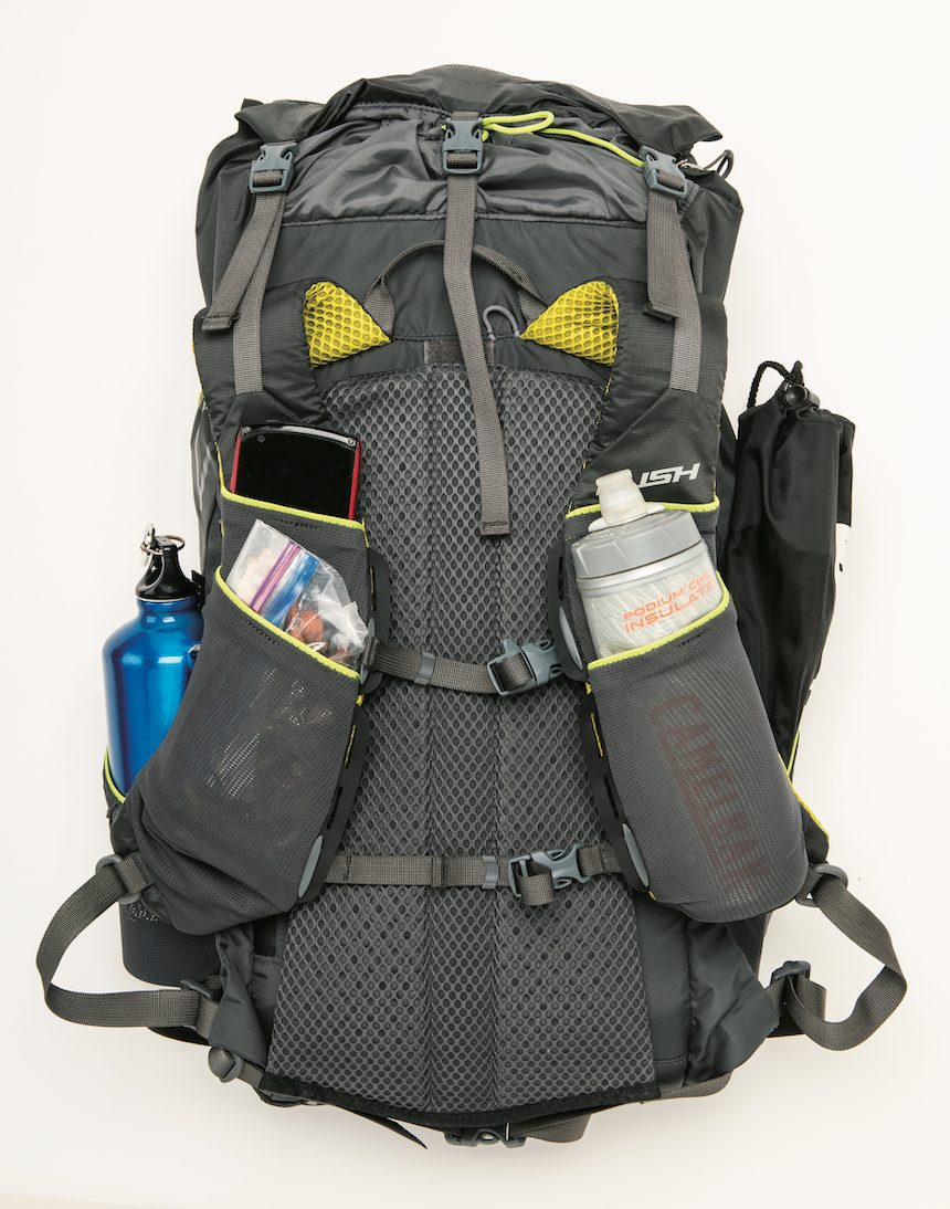 サイドポケットには行動中に摂取できるようにウォーターボトルや行動食を収納している