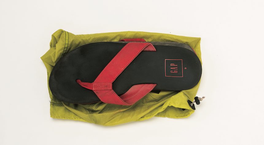 ▲サンダルはトップリッドとバックパック本体の間に収納。休憩時やハンモックで寝るときに