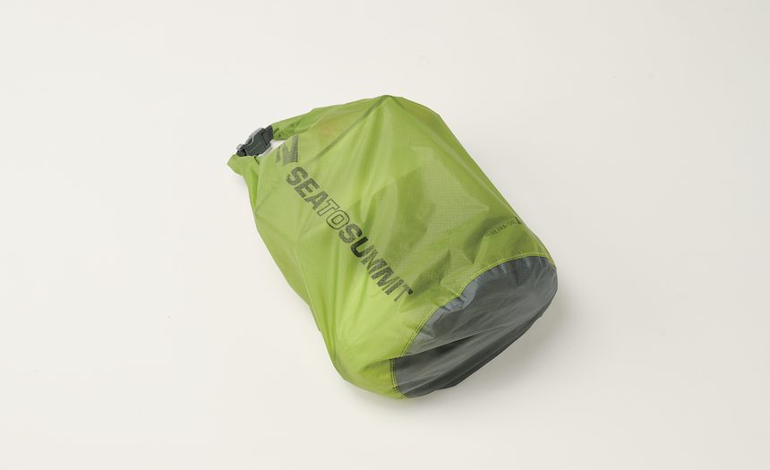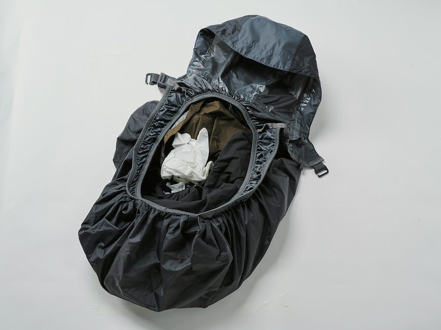 ▲バックパック用レインカバーを使わないときはウエアを収納するスタッフバッグとして活用。雨が降らないとき以外には登場しないアイテムを有効活用するテクニック。ちなみにレインカバーはフード付きで活用の幅が広いもの