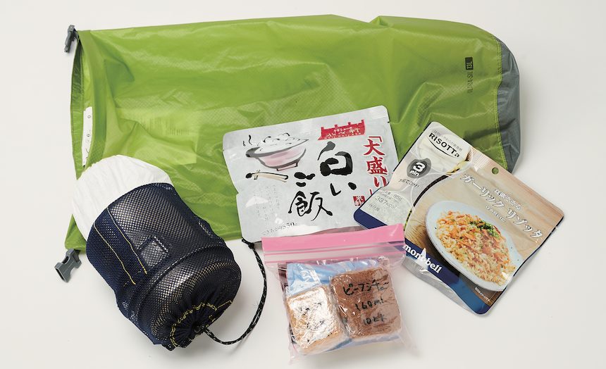 ほしいものをほしいシーンで取り出せるよう、行動食は分けて収納。「すぐに取り出せるショルダーポーチ」「少し立ち止まったときに食べられるサイドポケット」「バックパックを下ろしたときに補給する、かさばる行動食はトップリッド」。気分で選べるよう、さまざまな種類を少しずつ入れ、甘味と酸味や塩分を入れるのがポイント。フリーズドライは包装を予め取って小さくまとめる。白米は大盛りチョイスで、残りは翌朝のお茶漬けやスープリゾットに。