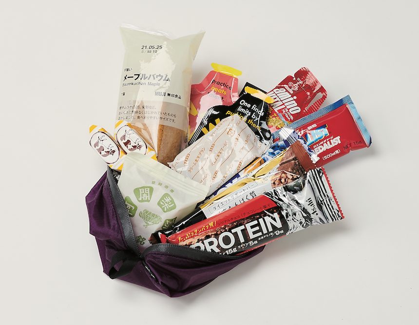▲▼バックパックのトップリッドへ入れておく行動食セット。バックパックを下ろして休憩す るときに。エナジーバーや饅頭、エナジージェル、アミノ酸顆粒など、行動中にすぐにエネルギーになってくれるものやお腹に溜まるものをセレクト