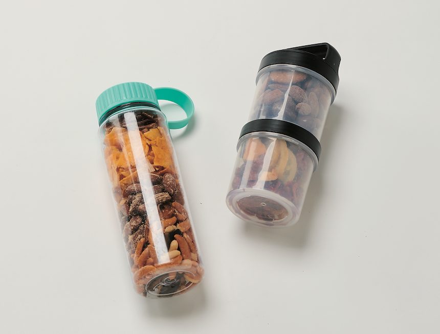▲しょっぱい系と甘い系の行動食をそれぞれ別ボ トルに分けて入れている。バックパックのサイドポケットに入れて行動中にすぐ取り出せるようにしている。ミックスナッツ、ドライフルーツ、柿ピー、スルメなど、夜のつまみにもなるセレクト