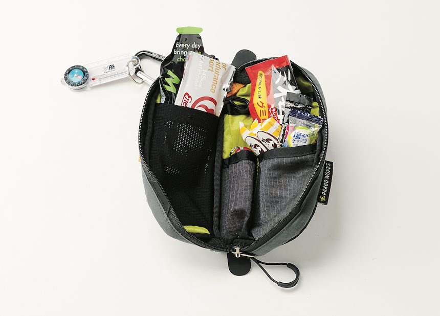 - 超緊急時用ファーストエイドミニポーチ。絆創膏や虫刺され薬など、行動中にすぐに使いたいファーストエイドを入れておく
