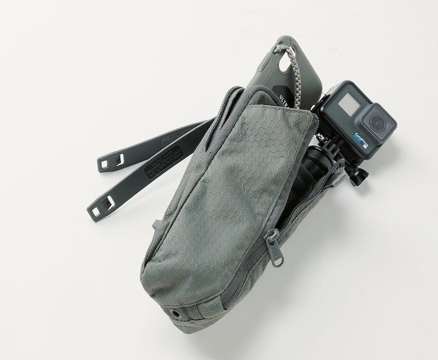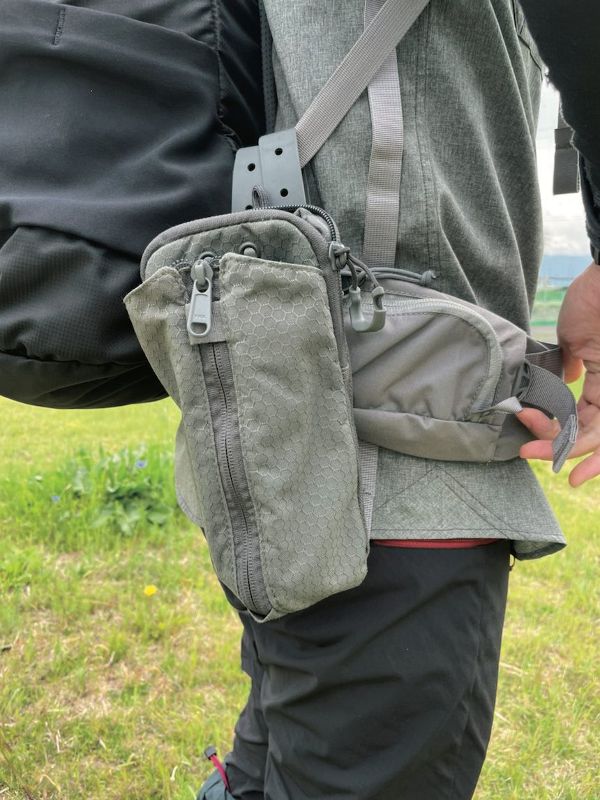 ▲▼バックパックのサイドに取り付けているポーチ。スマートフォンや GoProなど、行動中に取り出したいアイテムを入れておく。ウォーターボトルも入る