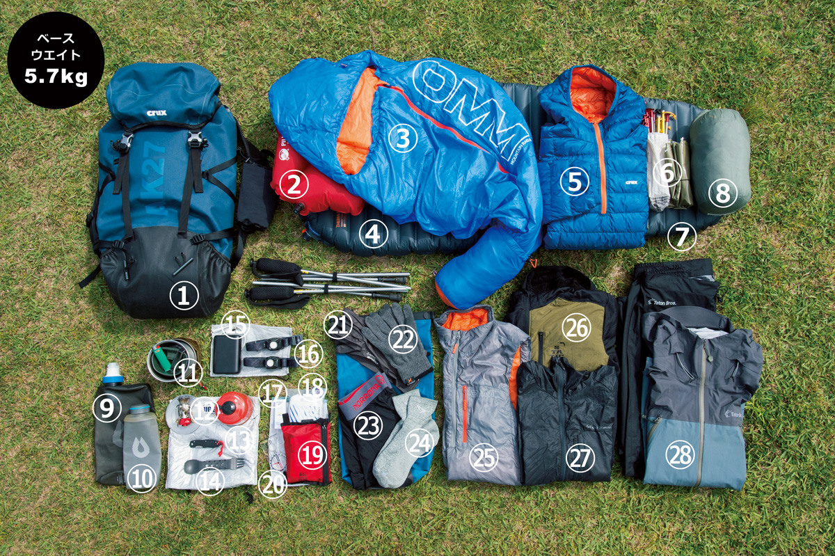 ULとまではいかないが、快適さと軽さのバランスを考えた軽量化が図られている。「目先の重量にとらわれず、必要なものはちゃんと持つように心がけています。僕の場合は行動中の体温調整や停滞時の保温などを重視しているので、ウエアは多めかもしれません。装備を軽くしたいなら、まずはぜいたく品を持たないこと。あとはトレッキングポールで立てられるシェルターのように、トータルで装備を減らせる道具を選ぶというのもひとつの方法です」