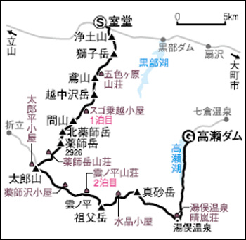 室堂までは立山黒部アルペンルートでアクセス。下山時は高瀬ダム、またはその先の七倉まで歩いて、タクシーで信濃大町駅まで向かう。高瀬ダムにコイン専用の公衆電話あり。