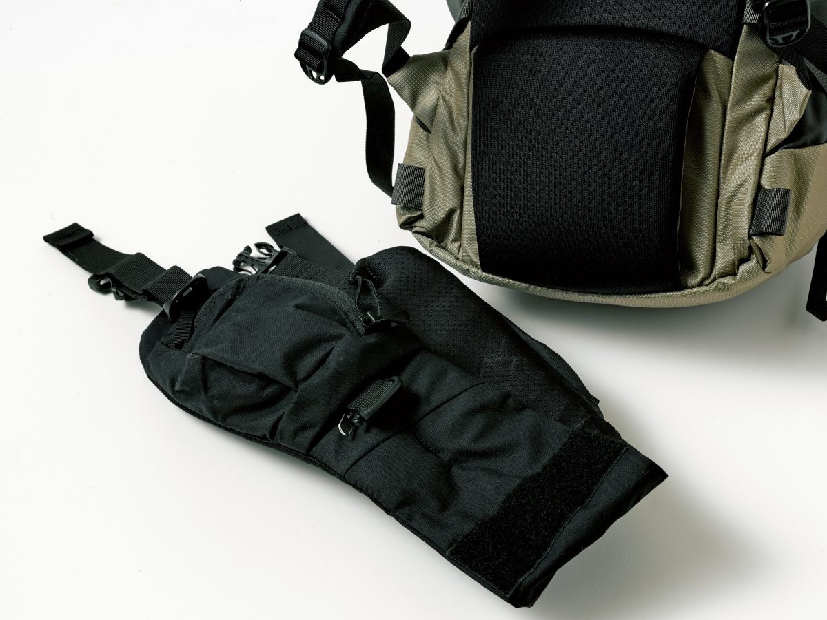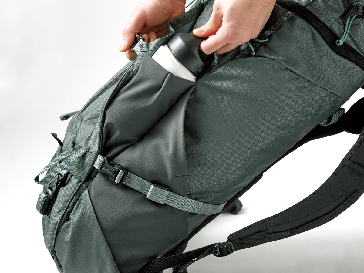 ▲フロントポケットはストレッチガゼット付きで、出し入れが容易。ストレッチ素材のサイドポケットには、1Lサイズのウォーターボトルを楽々と収納できる。