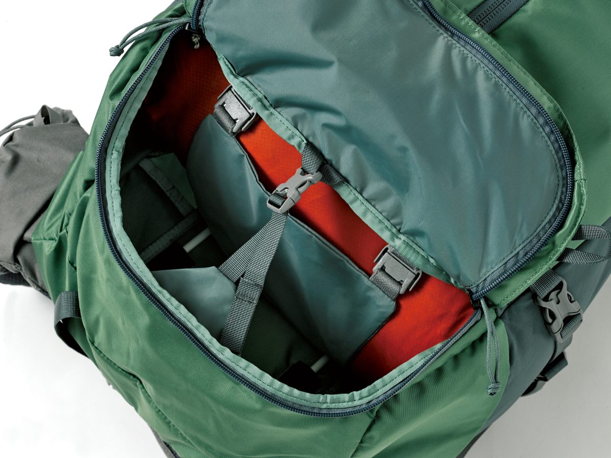 このデザインのメリットは、本体内へ素早くアクセスでき、かつパッキングが容易なところだ。フロント前面に開閉部を配置したバックパックは少なくないが、わずかな手数でパック自体がフルオープンするモデルはほかにない。