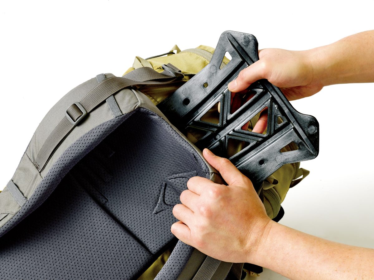 ▲背面長を無段階に調整できるミステリーランチ独自のフューチュラヨークシステム。調整時にはツールにもなるフレームシートは優れた背負心地に貢献する。