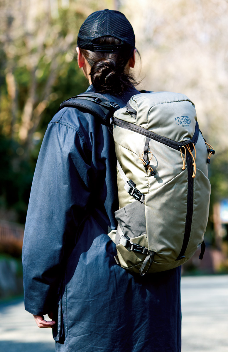 この3ジップデザインは、多くのミステリーランチ製品で展開されているが、そのなかでもっとも似合っているのがこのマルチパーパスなクーリーシリーズだろう。登山からハイキングや旅行、街使いに至るまで何役もこなしつつ、表に出かけるときにストレスを感じないカジュアルな使い勝手がある。それでいて、ミステリーランチ特有の堅牢さと背負い心地はしっかり踏襲している。