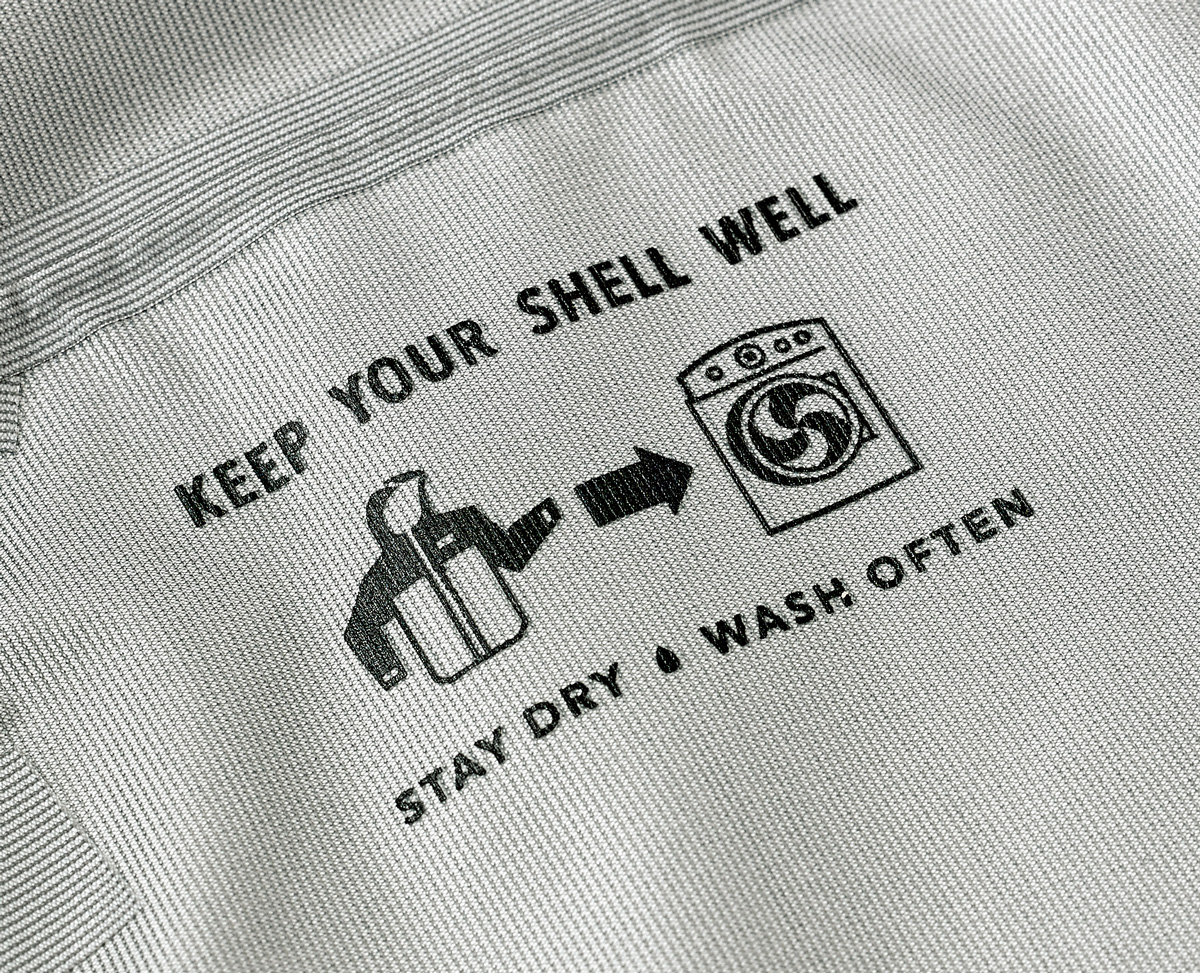 シェルの性能を維持しつつ製品寿命を延ばすため、必要なケアを製品内側にグラフィックで表示。長く使う=地球に優しい。