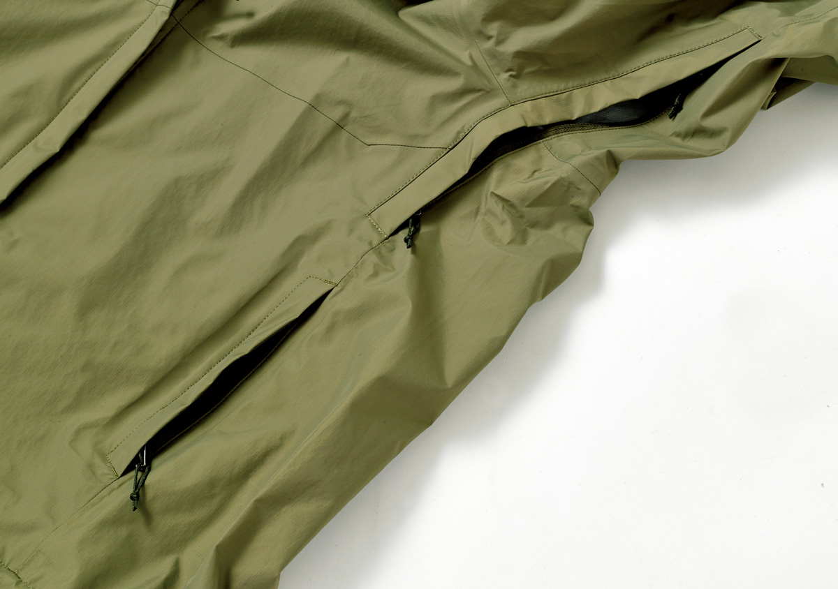 ハンドウォーマーポケットがふたつ。ベンチレーションは両脇の下に配置。ともに雨風が入りにくいストームフラップが付く。