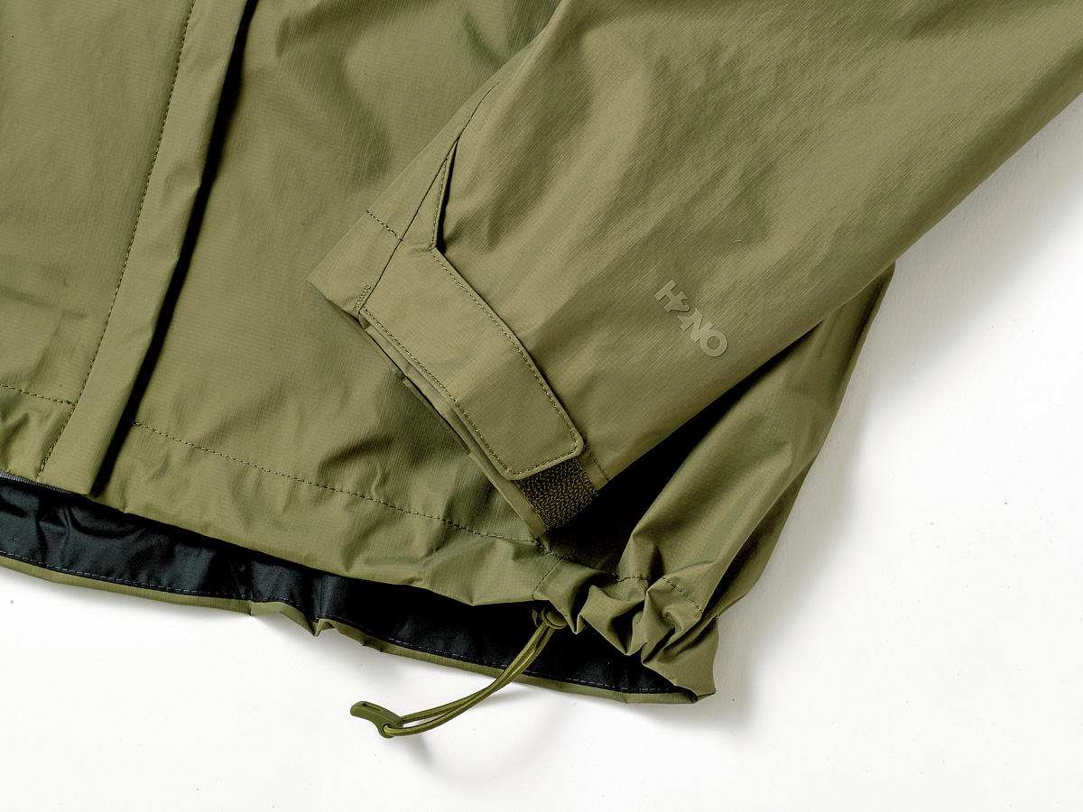 ベルクロテープが隙間を埋めて手首にフィットする袖。裾にはワンアクションで調整できるドローコードを内蔵している。