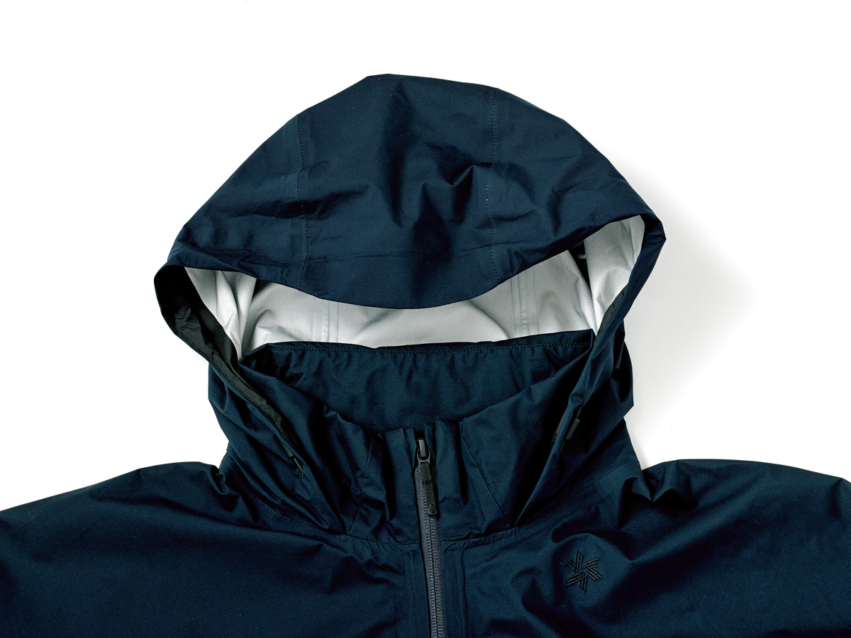 ▲フードは襟部分に収納できるビルトインフード仕様。フロントのメインファスナーは止水モデルを採用する。