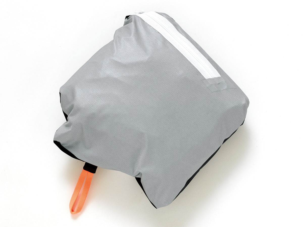 ▲左胸のチェストポケットに小さくまとめられるパッカブル仕様。カラビナループを使ってハーネスなどにぶら下げることも可能だ。
