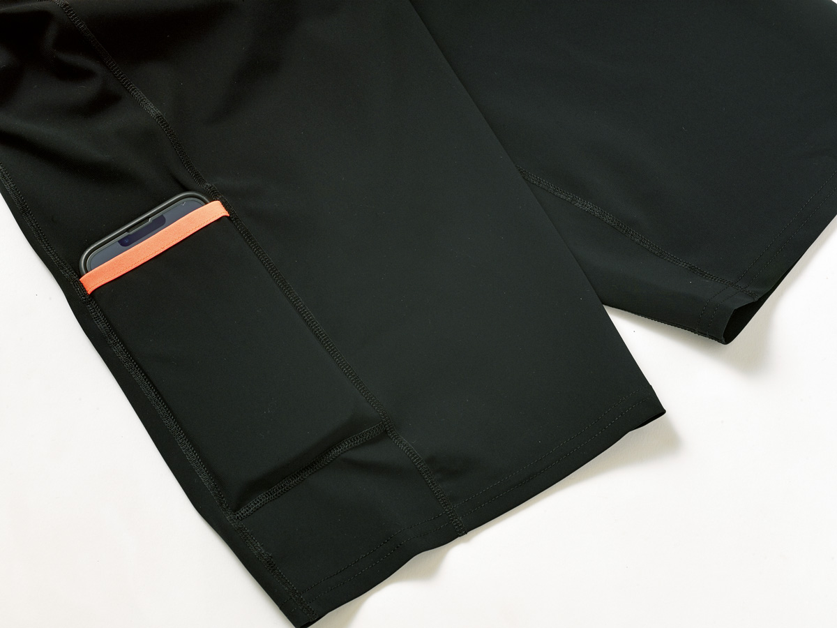 ▲アウターショーツの腰部分にファスナー付きポケット、両側にもサイフやジェルの持ち運びに便利なワイドポケットが付く。