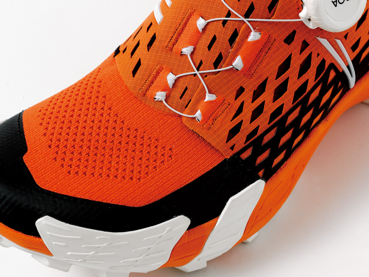▲メッシュアッパーは効率よく換気を促し、周囲を覆ったラバーが外部ダメージを軽減。