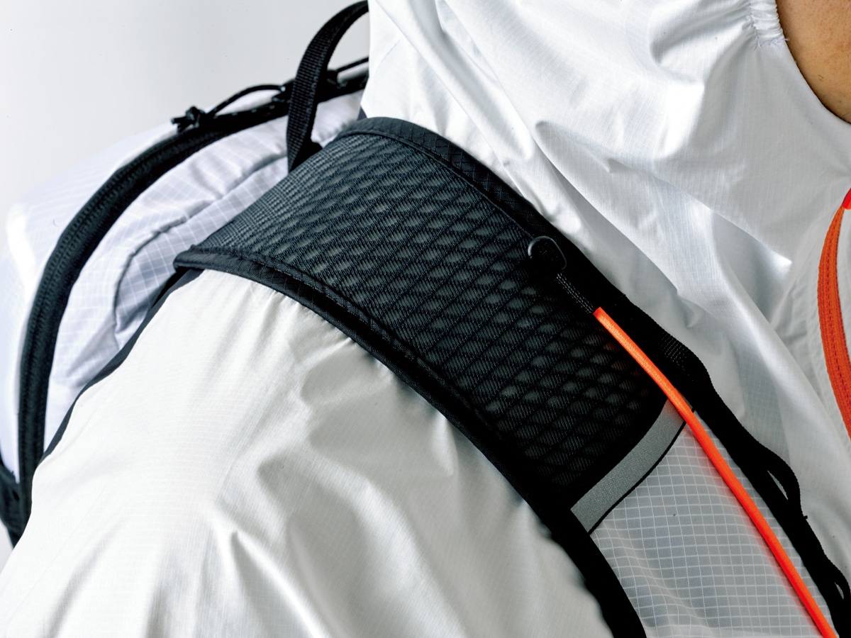 ▲ショルダーストラップは通気性の高いメッシュ素材。自然と肩のカーブに沿うエルゴノミックデザインで設計されている。