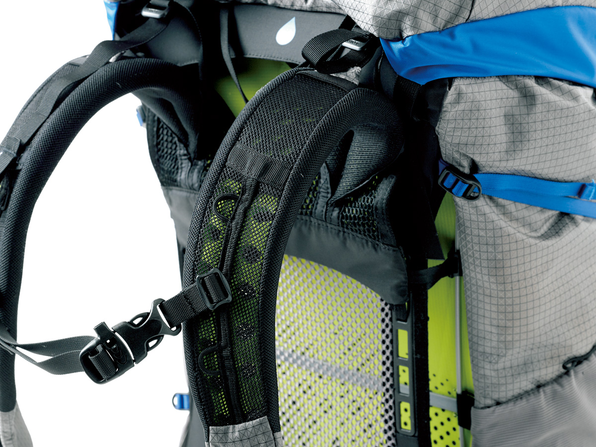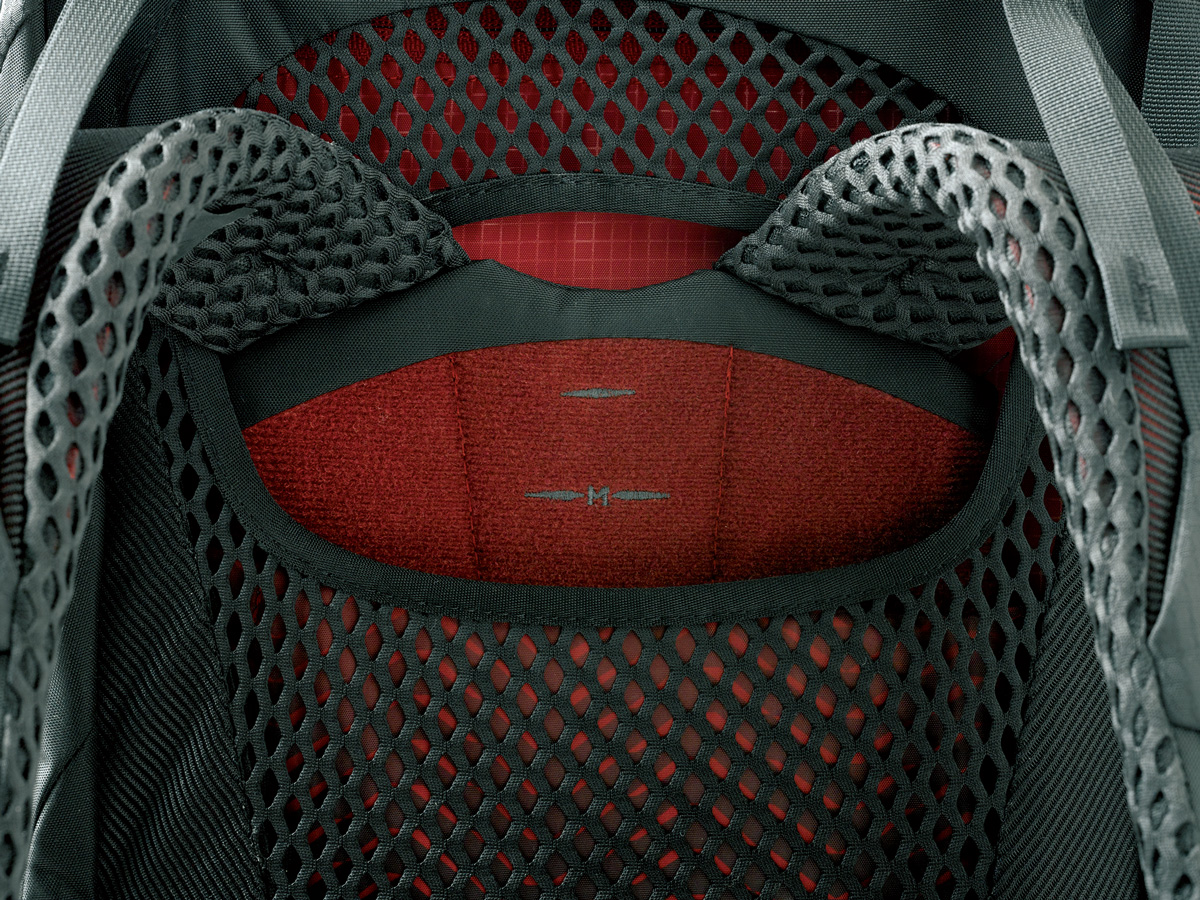 人気のエクソスに上位モデルが新登場。背面は湾曲させたワイヤーフレームとメッシュパネルで構成し、通気性を大きく向上。パッドをなくして軽量化しつつ、中央に横方向のステイを配して剛性を確保。その軽さから想像するよりも安定感のある背負い心地です。