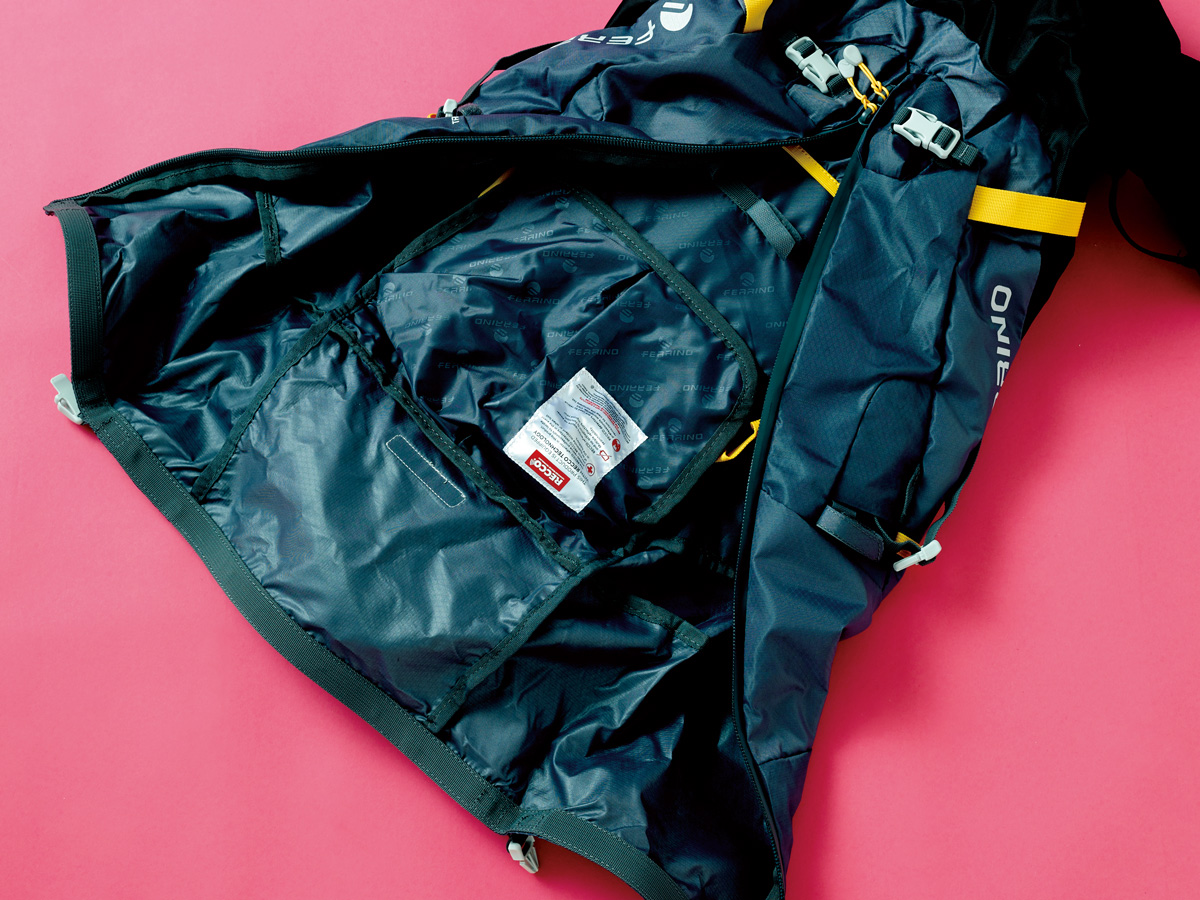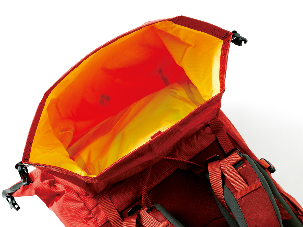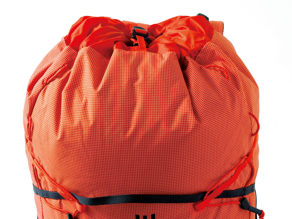 ENSA(フランス国立スキー登山学校)にも提供されている、アルパインクライミングを想定した細身のモデル。雨蓋、背面パネル、ヒップベルトは取り外し可能で、すべて外すと950gまで軽量化できる。開口部はロール式で、伸張すると容量を5ℓ拡大できます。