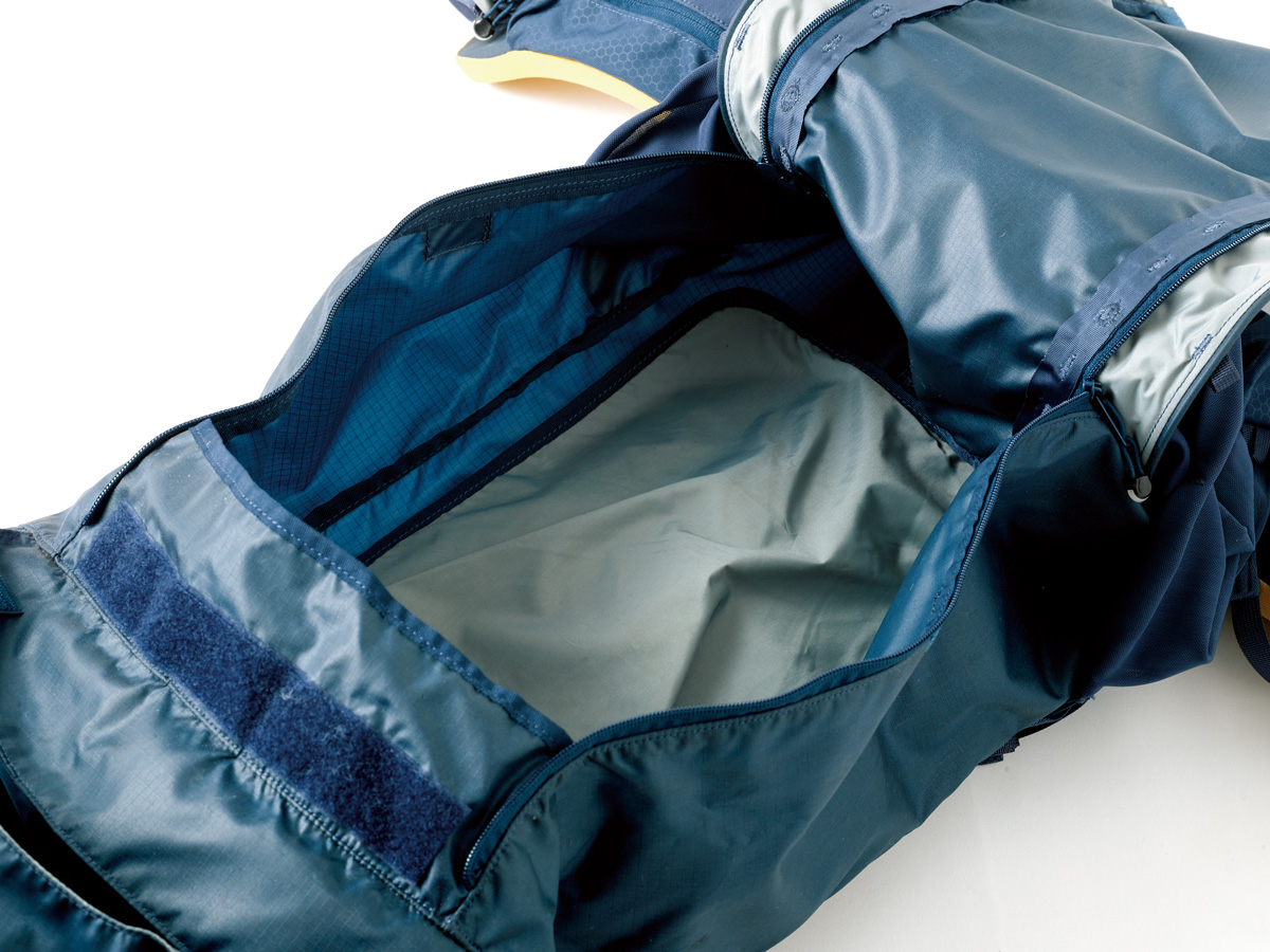 ひとつのパックで日帰りからテント泊縦走までこなしたい、そんな思いから生まれたモデル。ハーネス類は着脱可能で、25ℓから50ℓ程度まで容量を変えられる。フレームレスのパックは使いこなせばスムーズにパッキングでき、デッドスペースもできにくい。