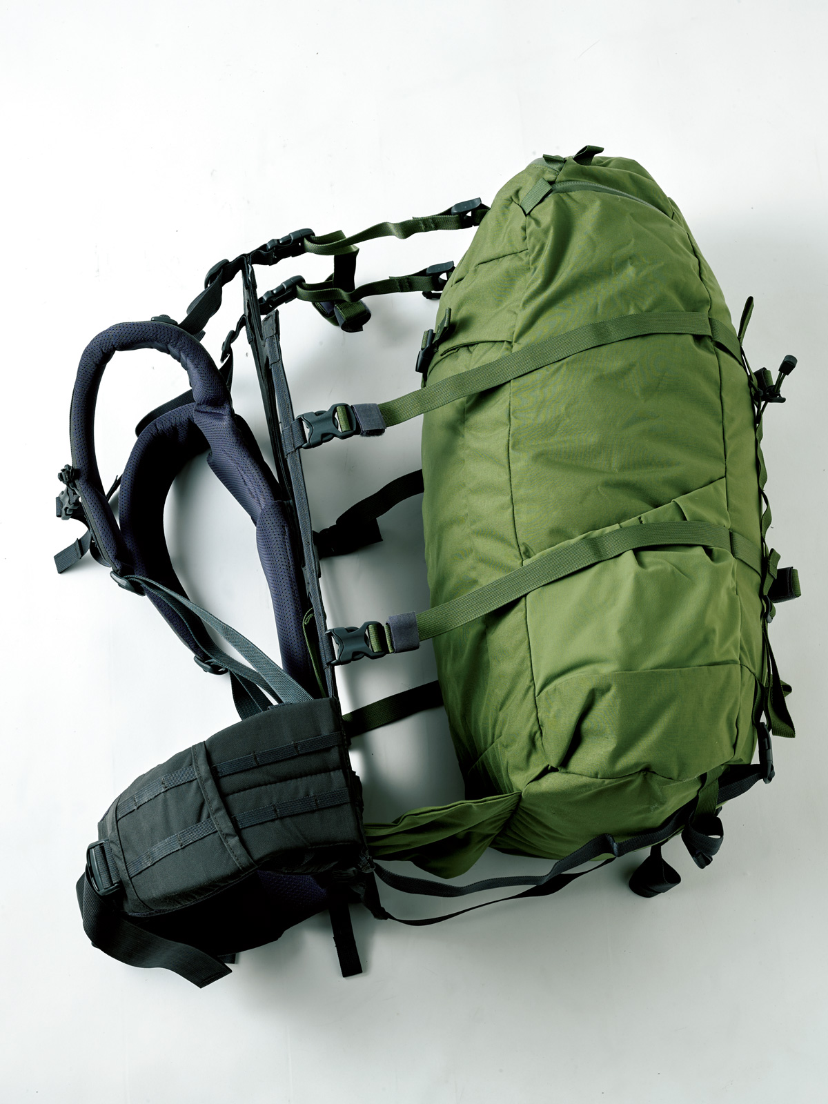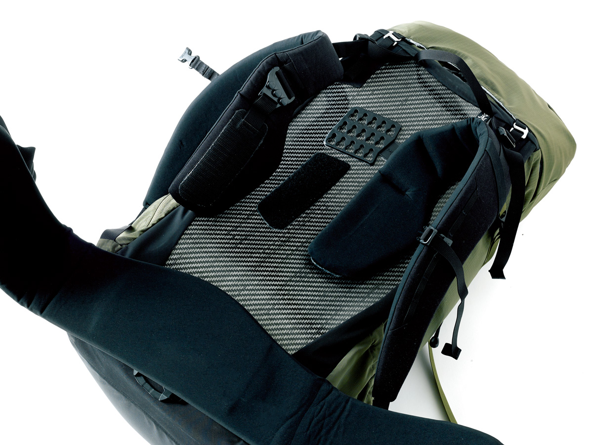狩猟の現場から生まれた「オーバーロード」機能を備える独創的なモデル。長いストラップで本体と背面フレームの間に空間をつくり、たとえばパックラフトのような嵩張る荷物が増える場面にも柔軟に対応する。強固なフレームで重い荷物もしっかり背負えます。