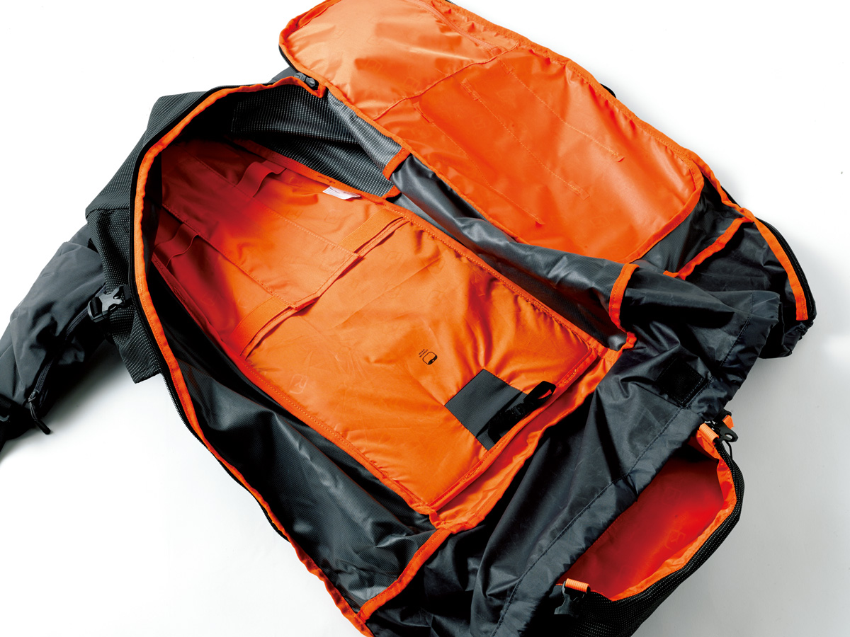 フロントには縦に2本のファスナーが走り、大きく開く。パッキングもスピーディだ。