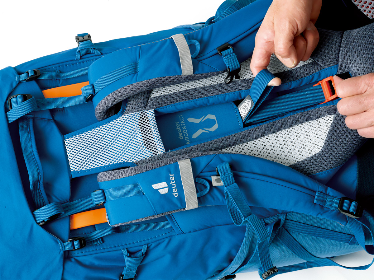 背負いやすさと通気性を両立したエアコンタクトシリーズにあって、コアは最大荷重25㎏という“もっとも背負える”モデル。体格に合わせて簡単に調節できる背面長や、軽量ながら効果的に荷重を分散するY字フレームにより、体への負担を軽減します。