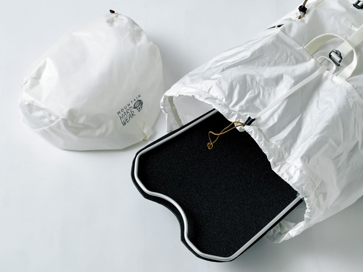 ひさしぶりに復活した大型パックは、冒険的なアルパインクライミングを目指すエキスパート向け。無駄を省いたシンプルなデザインで軽量化を徹底している。背面シートとフレーム、天蓋は取り外し可能で、すべて外した“サミットウエイト”はわずか600g。