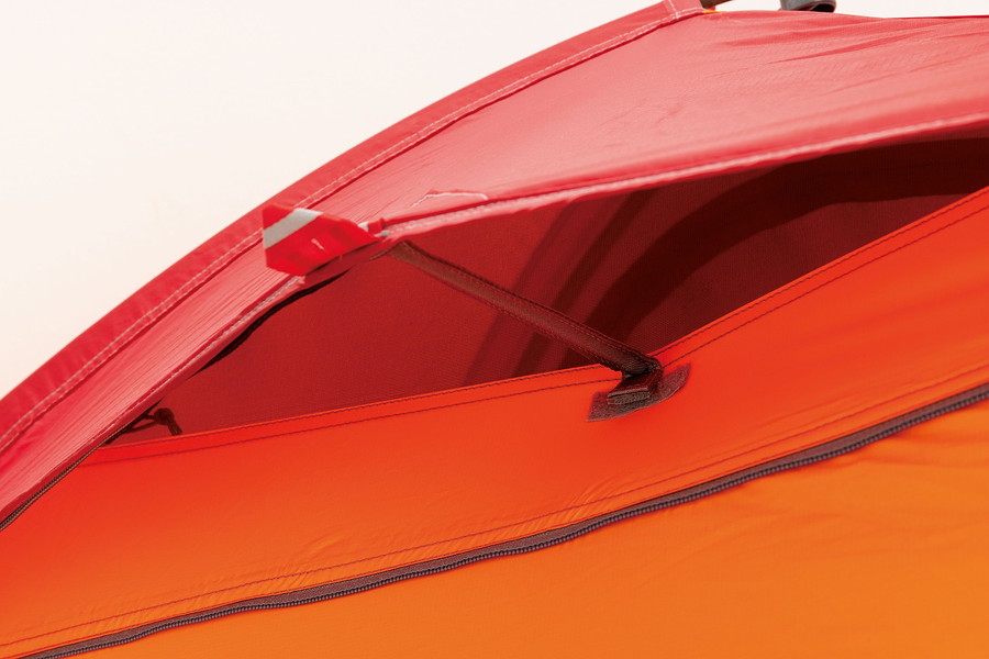 外側のポールでテント本体を吊り下げるシングルウォール式。2人用で1.5kgを切る軽量さだ。2層構造の防水透湿素材に加え、大きなベンチレーターで無用な湿気と熱気を逃がし、テント内を不快にする結露の発生を制御。発色もよく、雪山登山でも活躍する。