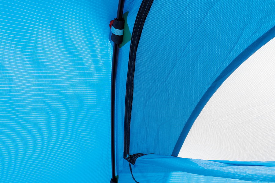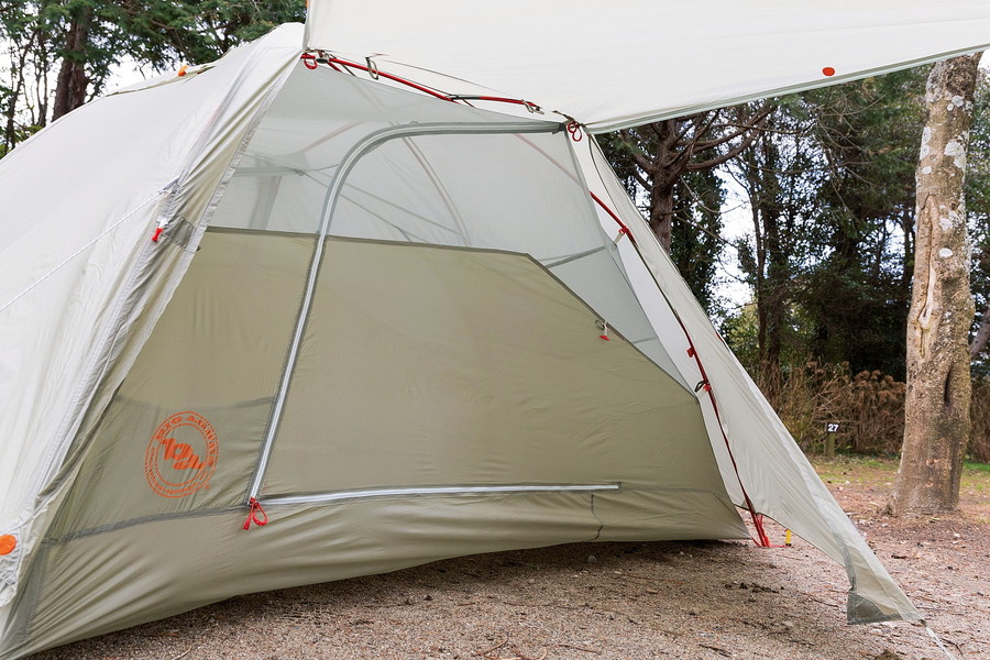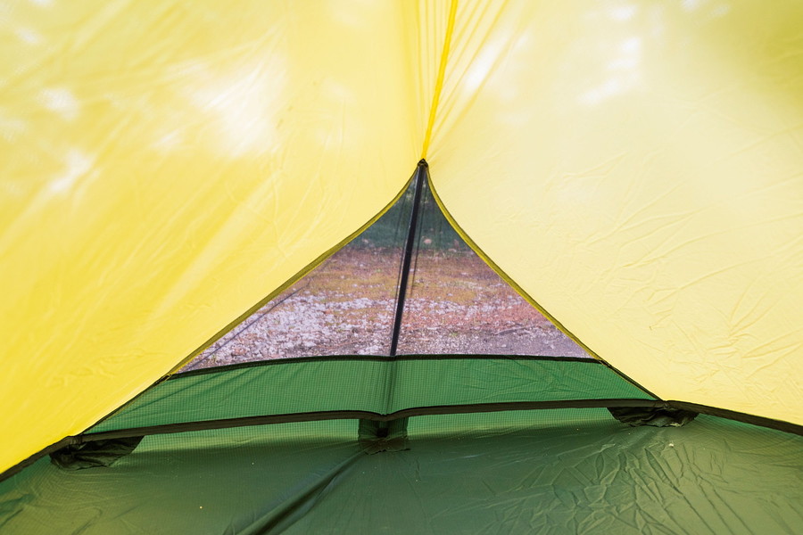 Y字型のポールで出入り口側を高く、広くするいっぽう、足元側は低く、狭くしたデザイン。これにより、居住性の高さをキープしながら使用素材を減らし、800g台の超軽量に。テントの短辺に大きな出入り口があるため、同宿者をまたぐことなく、いつでも出入りでき、2人で使っていてもストレスが少ないのもポイントだ。