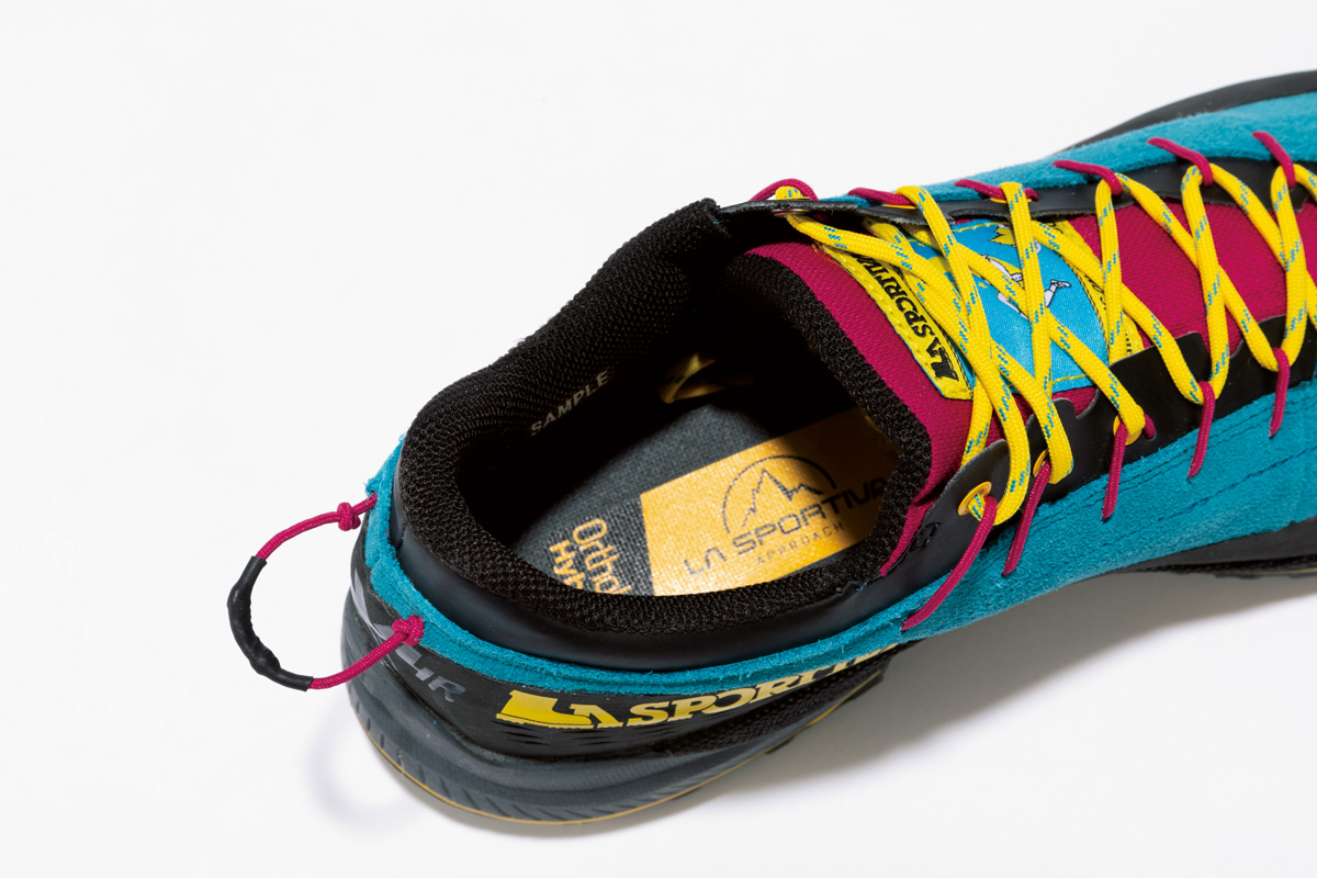 凹凸を少なくしたアウトソールは、スリップしにくいヴィブラムメガグリップ。つま先部分には溝をなくして平面的にしたクライミングゾーンがあり、岩場の小さな突起にも足をかけやすい。シューレースは細いコードに通す仕組みでスムーズに締められる。