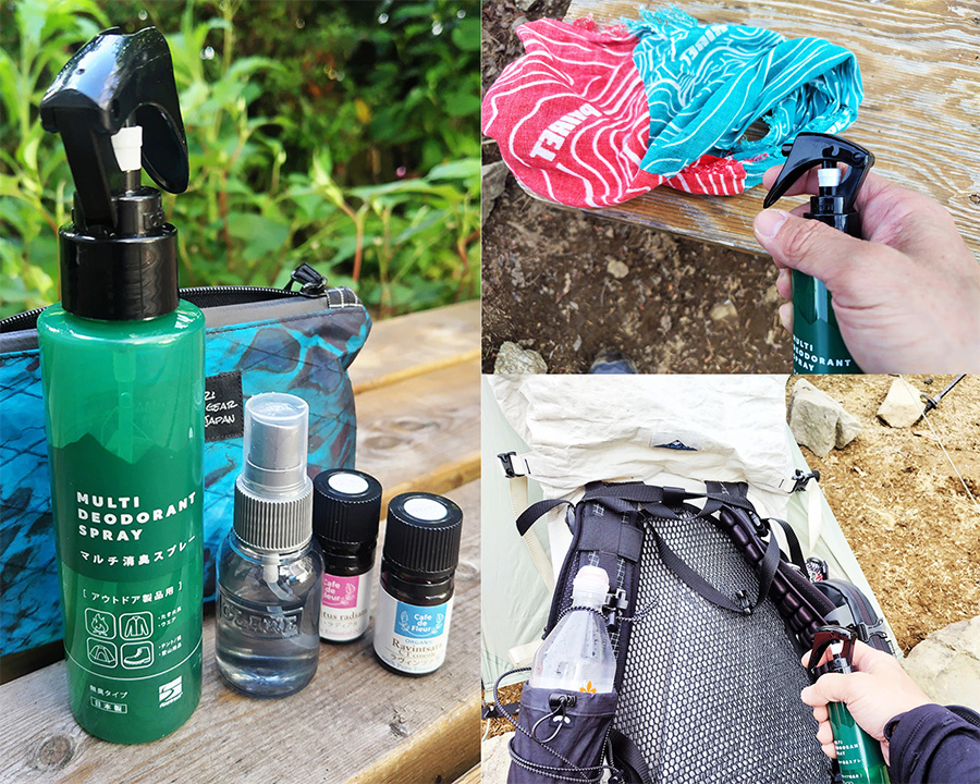 「マルチ消臭スプレー」を吹きかけてしばらくすると、さっきまでの汗の臭いがしなくなっているではないですか!なにより有難いのが消臭効果はあっても無臭だということ。少し前からテント泊の際に安眠とリラックスする時間を楽しむためにアロマを焚くようになったのですが、他の香りと混ざらずにアロマの香りを楽しめたおかげで、夜から降り出した雨も気にならずに安眠することができました。