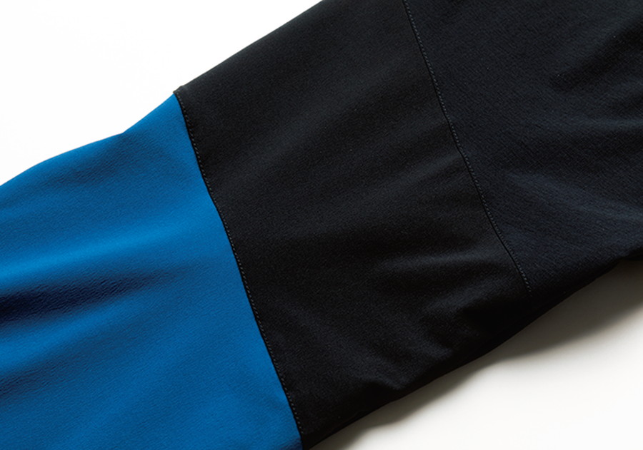 裏地に凹凸があり、適度な伸縮性をもつパーテックスイクイリブリウムを採用。ウインドシェルのような着心地ながら動きやすく、素肌に着用してもベタ付かずドライ。ヒップパネルは生地を二重にすることで強度を担保した。