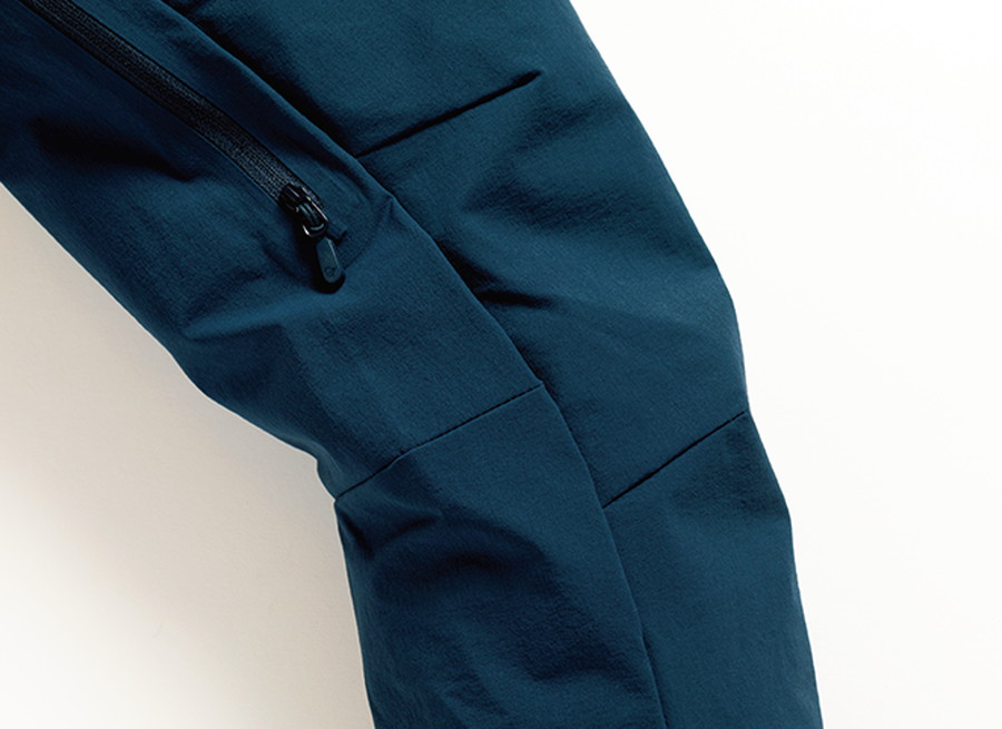 脚を通して感じるのが、細身ながら窮屈さを感じないその穿きやすさ。速乾性に優れ、適度な厚みをもつ4Wayストレッチ素材を使用し、その伸縮性から大腿部のジッパー付きポケットにものを収納しても動きがスムーズ!