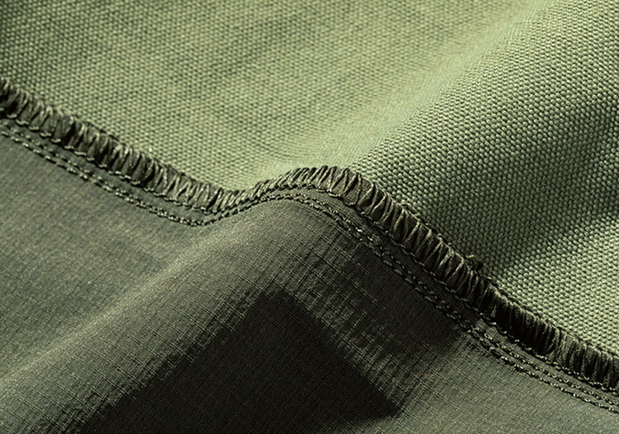 ポリエステル100%ながらコットンライクな生地はテイジン「ソロテックス」。高い撥水性をもち、肌触りが柔らかく伸縮性に富み、型崩れしにくい素材で、山から街までとおしで使いたくなる。スッキリしたテーパードデザイン。