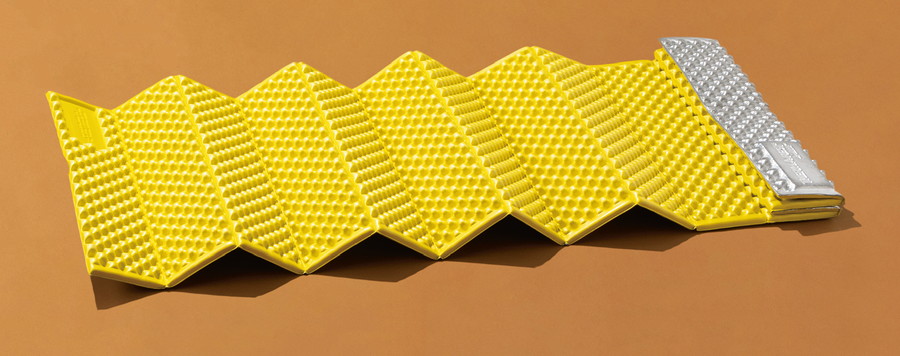 かさばる折り畳み式の弱点は、バックパックに外付けすると木の枝や岩に引っかかりやすいこと。だが、このマットは引っかかりがちな角の部分に丸みを帯びさせ、その欠点を緩和した。シルバーの面は剥がれが少ないアルミのフィルムで、断熱性を長期間キープする。