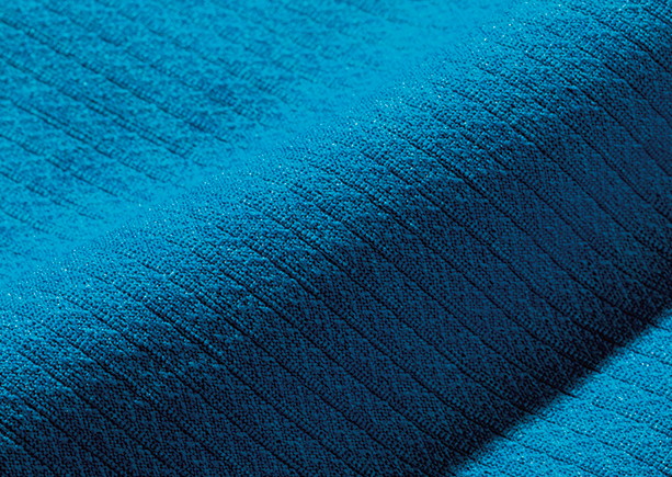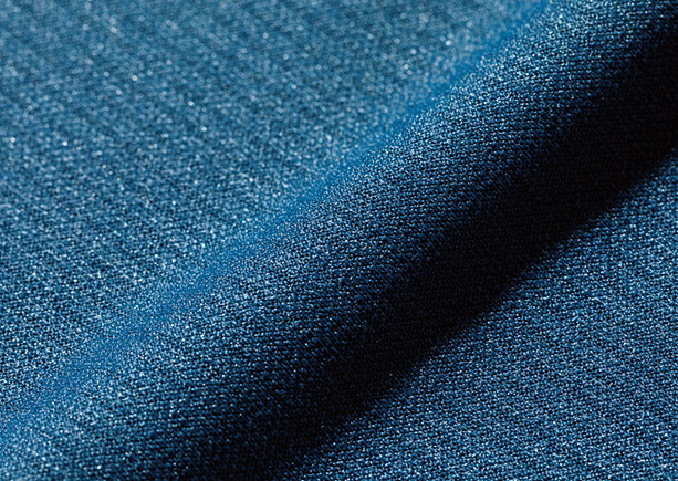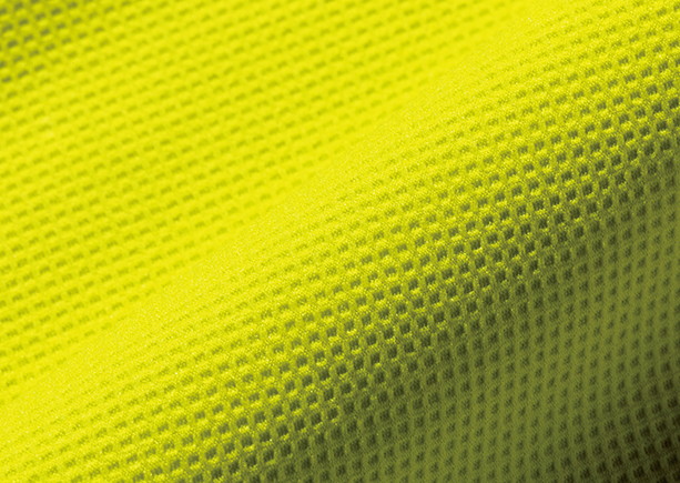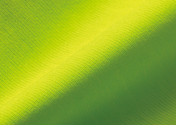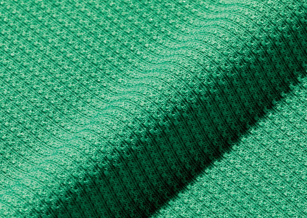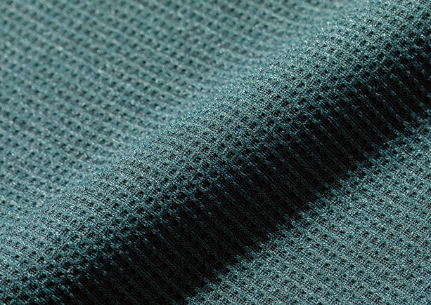 ポリエステルの高密度素材「デルタピーク」を使用。独特なふくらみのあるソフトな風合いや速乾性、通気性、伸縮性などを併せもつ。脇と肩甲骨部には吸水機能のあるメッシュを用い、高機能シャツに。