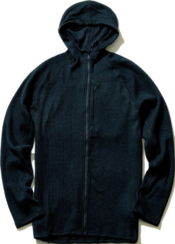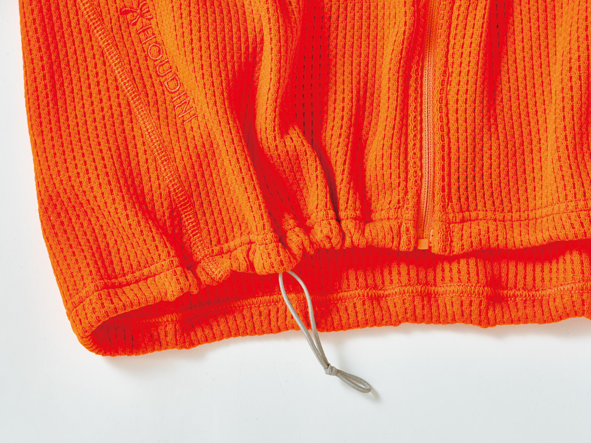 フーディニの着想に応えてポーラテックが開発したのが、パワードライネットメッシュだ。肌側を甘く、外側を密に編んだパワードライの二重ニット構造が、汗を素早く吸い上げて拡散する。クルマのラジエターのように整然と並んだオープンメッシュは空気の流れを妨げず、外気に晒せば素早く熱を放出する。逆に、シェルで外側を塞げばカサのあるメッシュに閉じ込められた空気が体温で温まり、優れた保温性を発揮する。